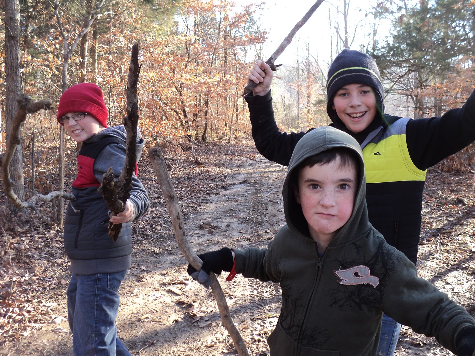 | The boys had been enjoying some sword fighting. They turned this into a silly picture when Kim raised the camera to her eye. |