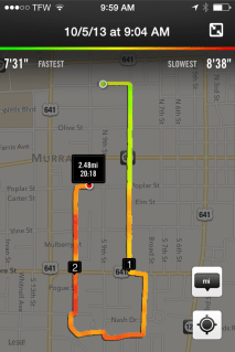 This race didn’t turn out like I had planned. I didn’t take time to do a warm-up mile before the race so my heart had to elevate much too quickly as I took off. I should have known better.I started off at a 6:52/mile pace but the jolt to my heart rate and the hills slowed me down quickly. I finished the first mile in 7 minutes and 31 seconds. I finished the second mile in 8 minutes and 38 seconds. I ran another .48 miles before I had to stop and averaged an 8 minute 42 second mile for that stretch.
