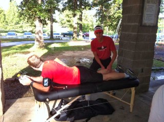 After finishing (with a time of 30:16 – my slowest time by far!), I went to the pavilion where Russ Shemberger massaged my calf and easily found the trouble spot. His massage felt pretty incredible (Molly Franklin took a picture of me on the massage table. lol). He also told me that I need another pair of shoes (I didn’t realize that I’ve logged almost 500 running miles on these). I also need to do a little better at hydrating during the day.Hopefully, this doesn’t mess up my half marathon in two weeks. I planned to run it MUCH slower than this race but if my calf doesn’t heal up, I’m not going to get into an endurance race. I’ve got some healing and choices to make in the next 13 days.