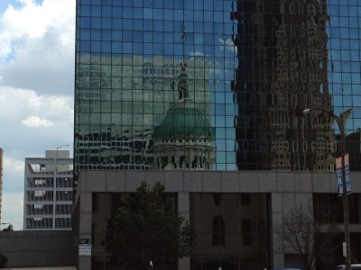 After visiting the Gateway Arch with my family, Kim wanted to check out the Old Courthouse. You can see the courthouse in this picture I took at the top of the Gateway Arch. It’s the building with the green, round top.