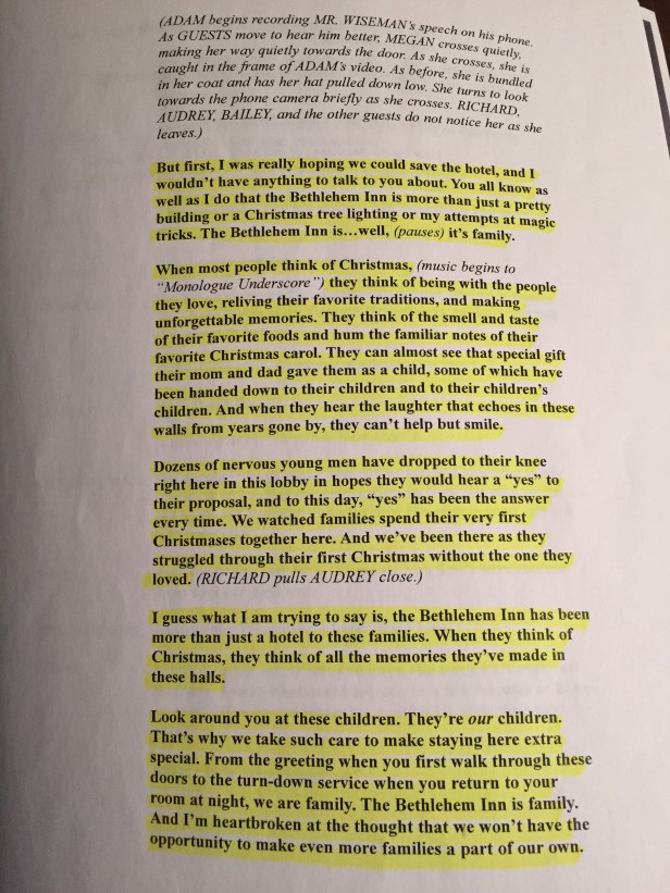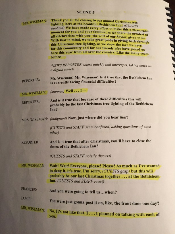 To give you an idea of how many lines I had to memorize, the following two pages are a few of my lines and the monologue (my lines are in yellow). There are about 50 others lines and the songs not pictured here.