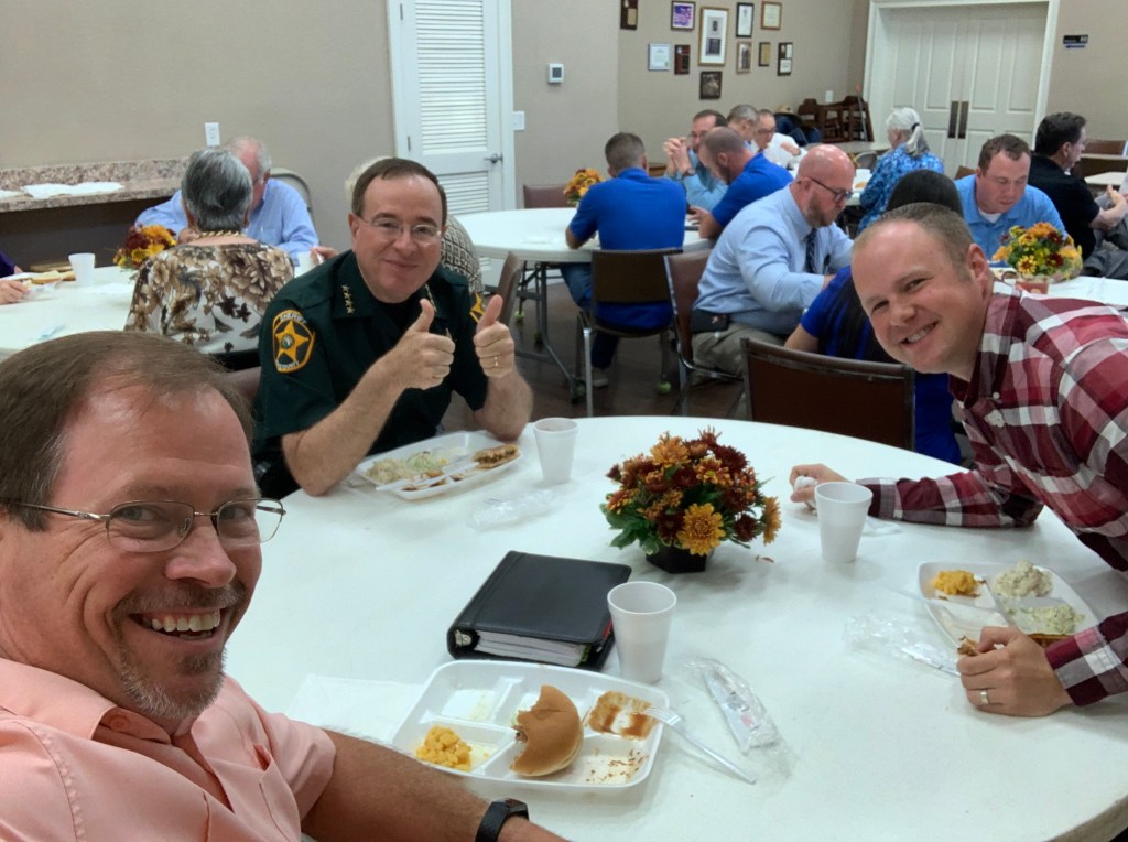 As the service began and a prayer was prayed, we were encouraged to make our way to the fellowship hall where we were to enjoy a meal. Drew and I got our food and sat down. Moments later, I looked over my left shoulder and saw Sheriff Judd heading in our direction. He stopped at our table and asked if he could join us.