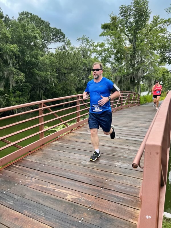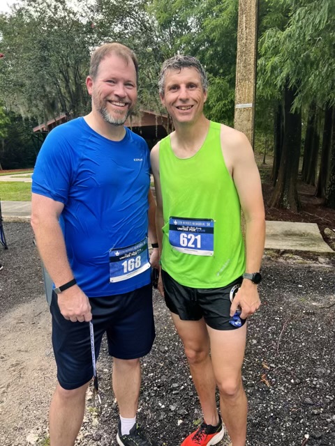 In this race, I hadn’t been training enough. I am also carrying around a bunch of unwanted weight. I weighed in at 242 lbs this morning. So, as much as I hated to do it, I had to stop and walk a few times. I was even thinking about stopping to walk about a quarter-mile from the end of the race. But Neil Clements ran back after finishing his race to run the last bit with me.
