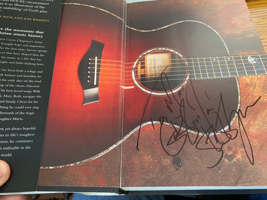 Fast-forward to a few weeks ago, Gladys Rouleau, a member of the church I pastor, told me that she was going on a Steven Curtis Chapman Alaskan Cruise. She knew I was a fan and said that she would try to get something signed if I wanted. I purchased a hardback version of his autobiography and gave it to her, hoping that the next time I had it in my hands, it would have SCC’s autograph.