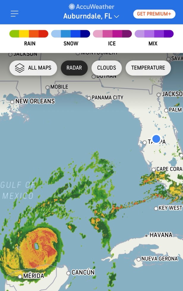 The next screenshot is the trajectory. We anticipate having it go over (or near) the top of us around 4 AM on Thursday. Hurricane Milton is anticipated to be a Cat 3 when it hits near the Tampa Bay area and should be downgraded to a Cat 2 or 1 when it gets to us. The damage to the Tampa Bay area could be like none they’ve ever experienced before, depending upon the precise location that the hurricane makes landfall.