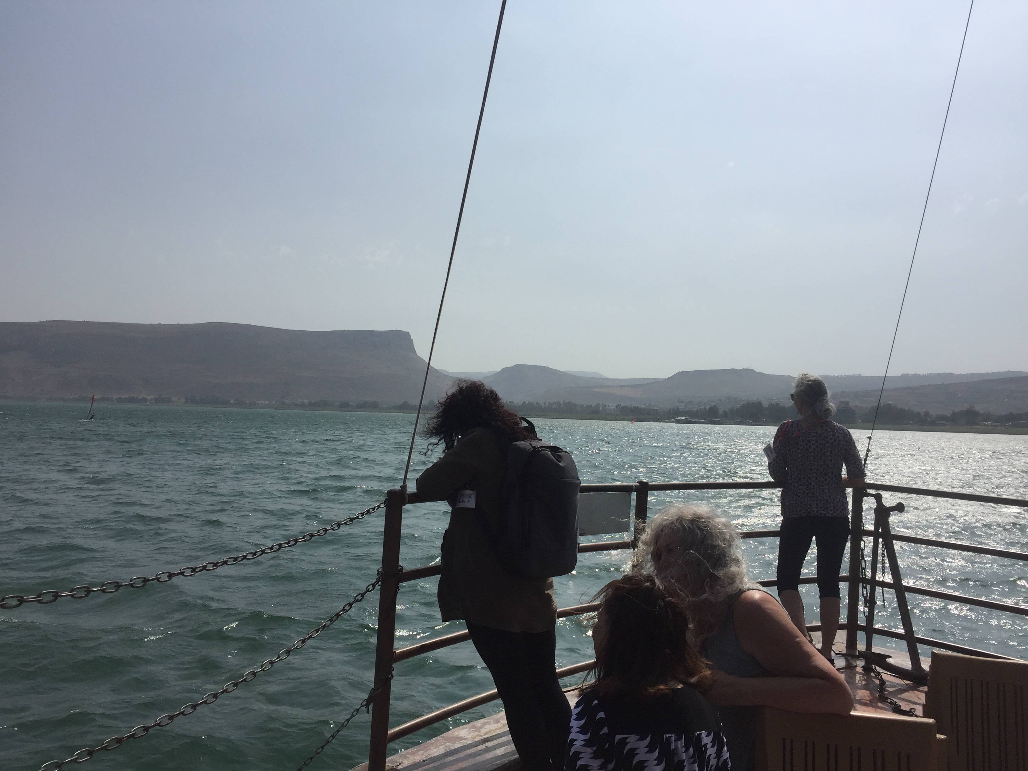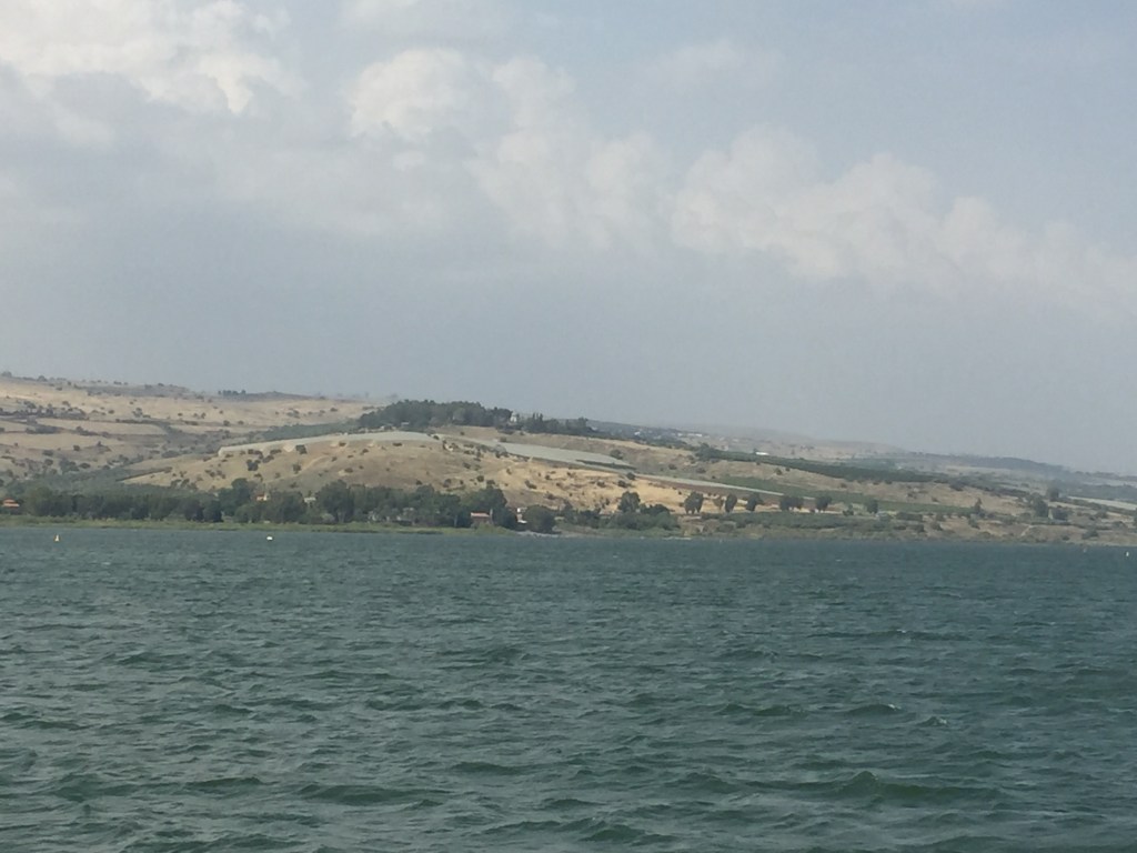Taken on a boat on the Sea of Galilee, looking at the Mount of Beatitudes