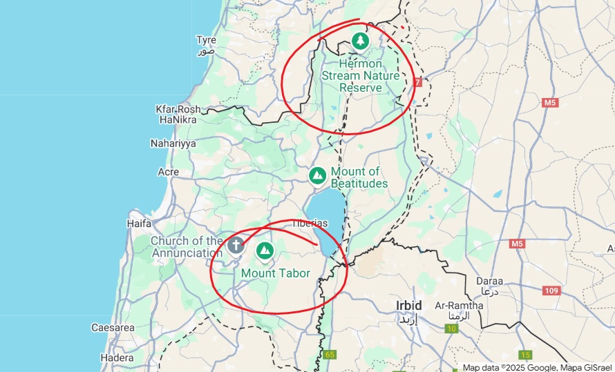 First, where did it happen? Most scholars think it took place either on Mt. Herman or Mt. Tabor. Here is a map to show where those mountains are located in relation to the Sea of Galilee.