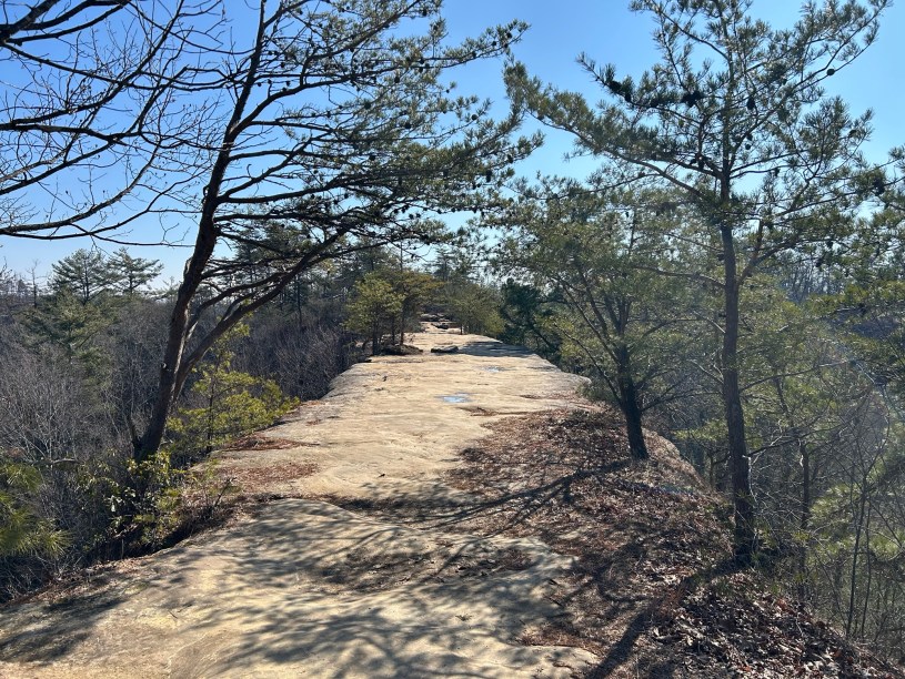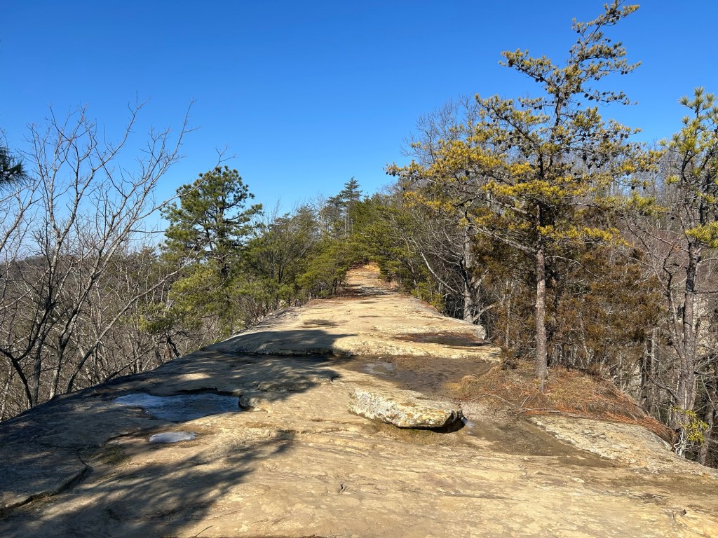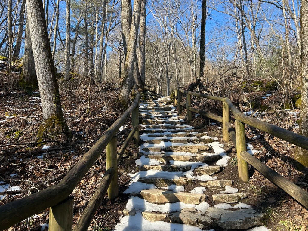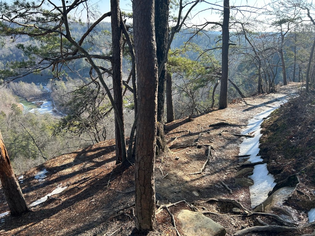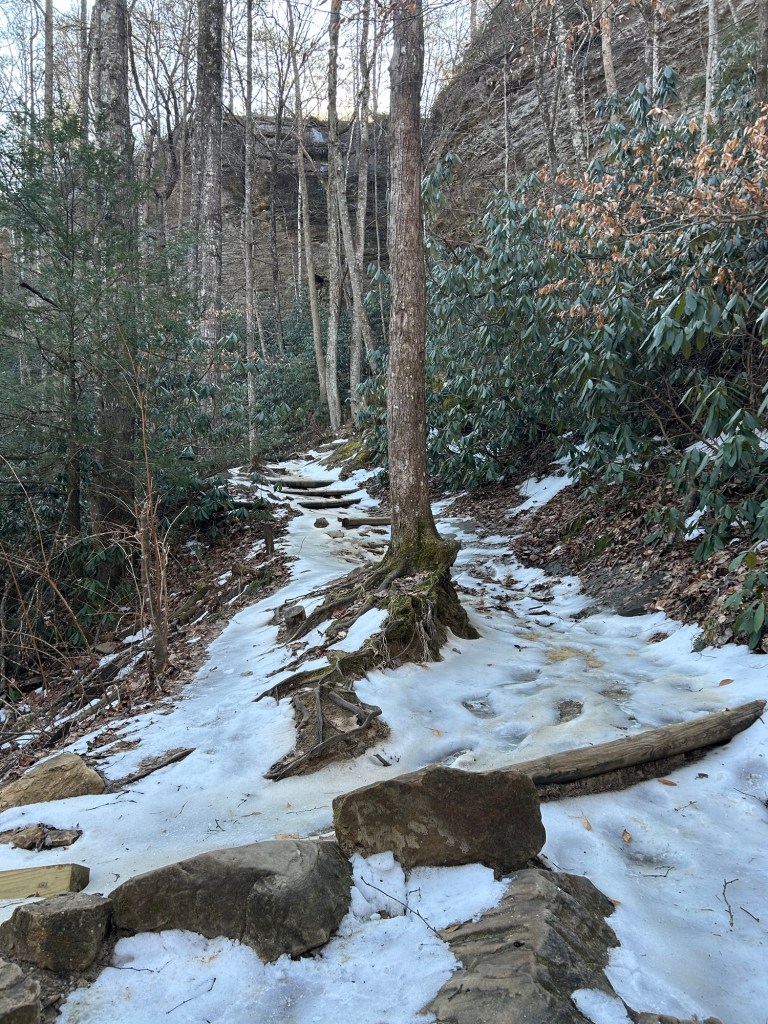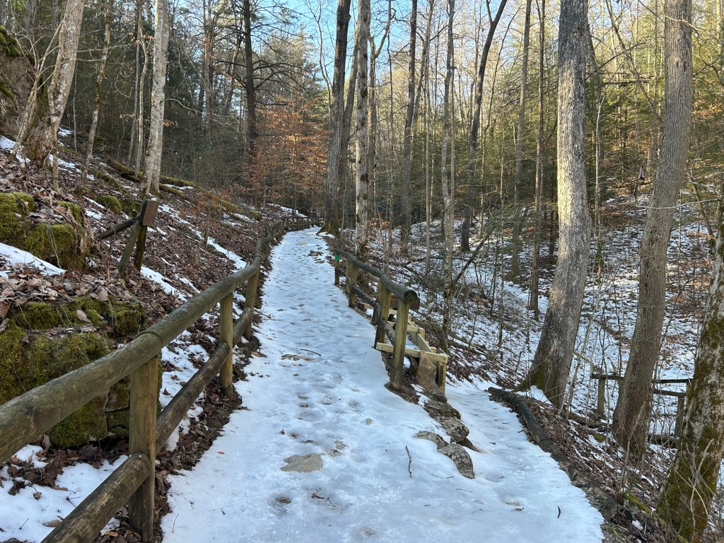 The cliff is mere feet from the trail. In some places, the trail was completely covered with ice. I wanted to go to Lover’s Leap, but the trail became fully ice-covered and angled toward the cliff. If I started sliding, I would have gone over the edge because there were no trees to break my fall. It wasn’t worth it, so I turned around.