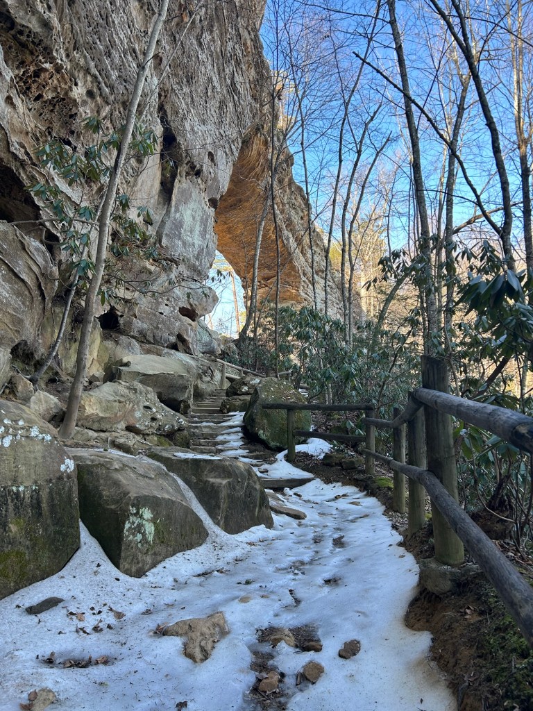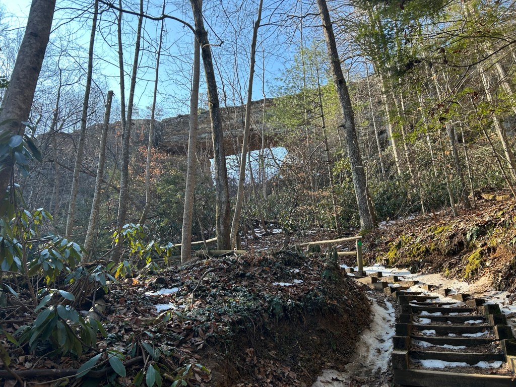 However, as I arrived, I quickly noticed that the park had much more snow and ice than we had back in Richmond. I knew it would be a bit dangerous, but I had driven an hour, so I wanted to make the most of it. I made my way up the treacherous (icy) half-mile trail to the Bridge, spent some time at the top, and then slid back down (slipping a lot and falling onto my back twice).