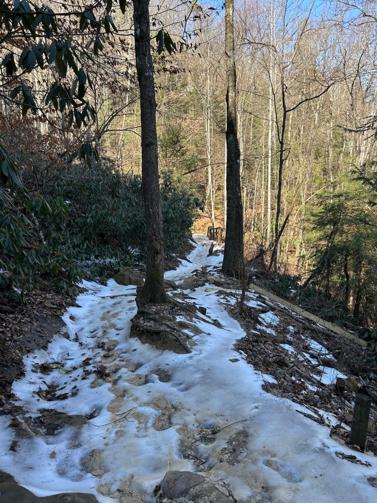 Soon, it was nothing but ice. And since the trail is very rarely flat, I was sliding all over the place (and holding onto the rail or clinging to trees most of the time).